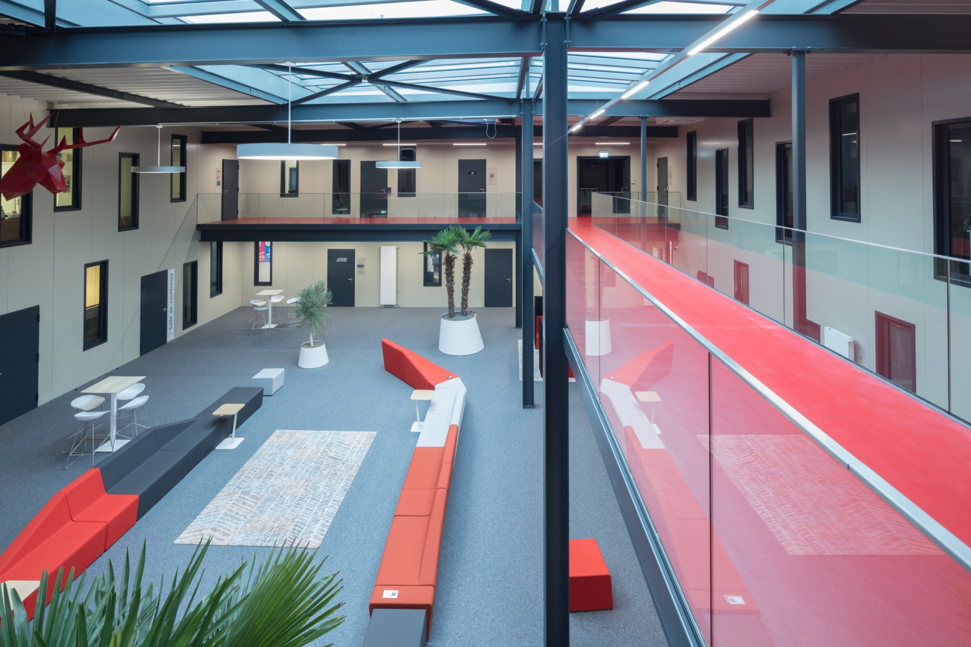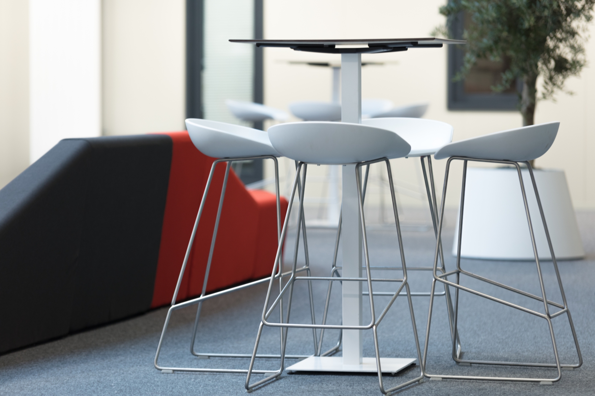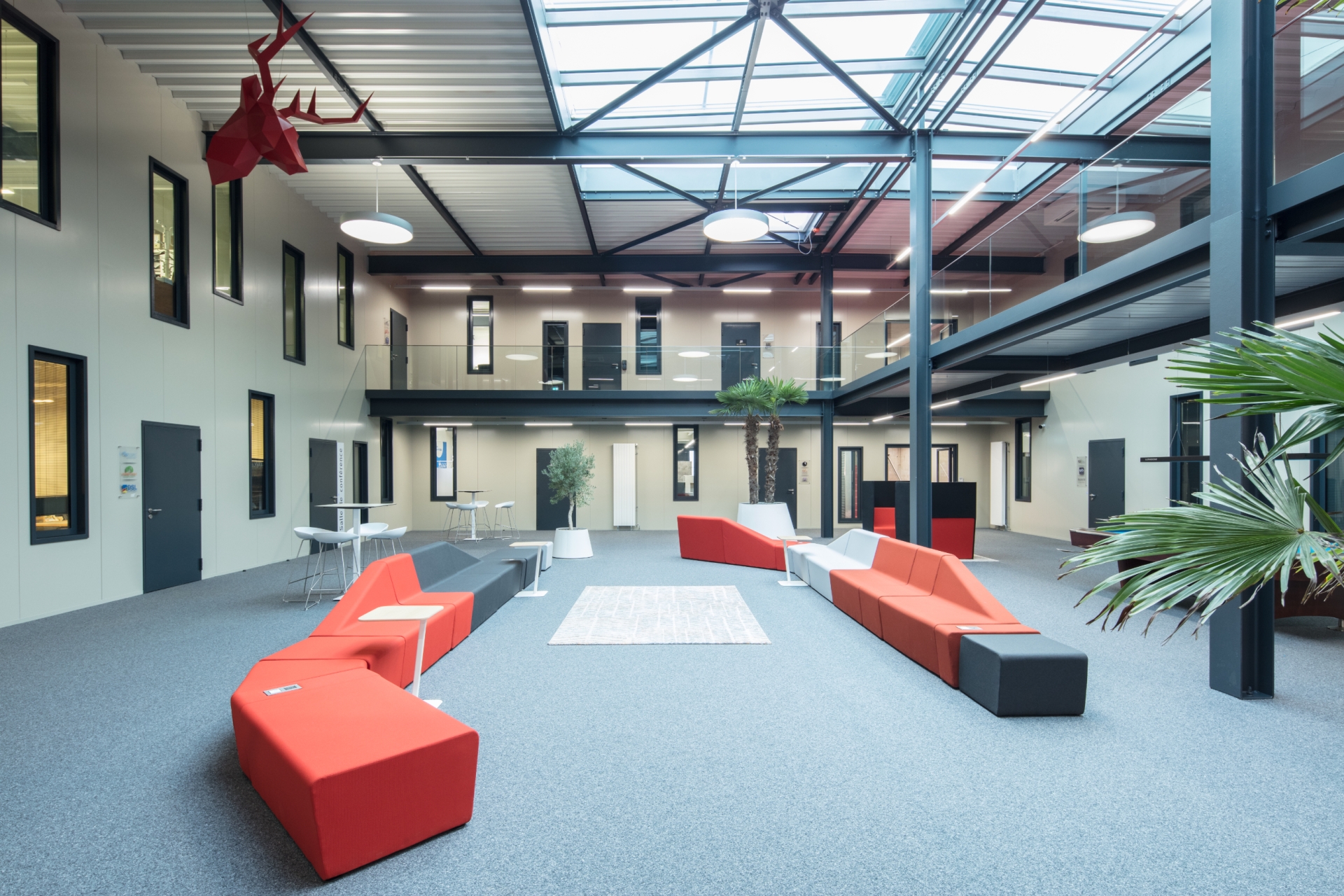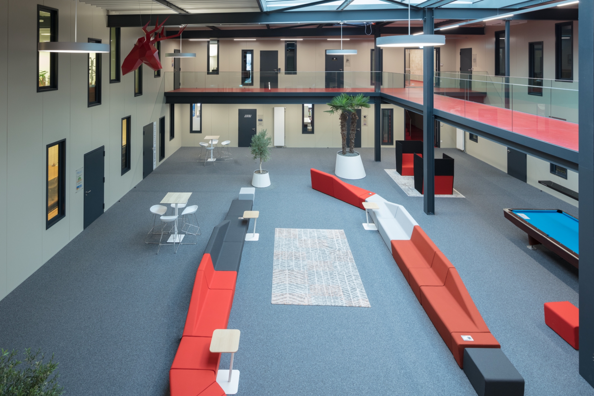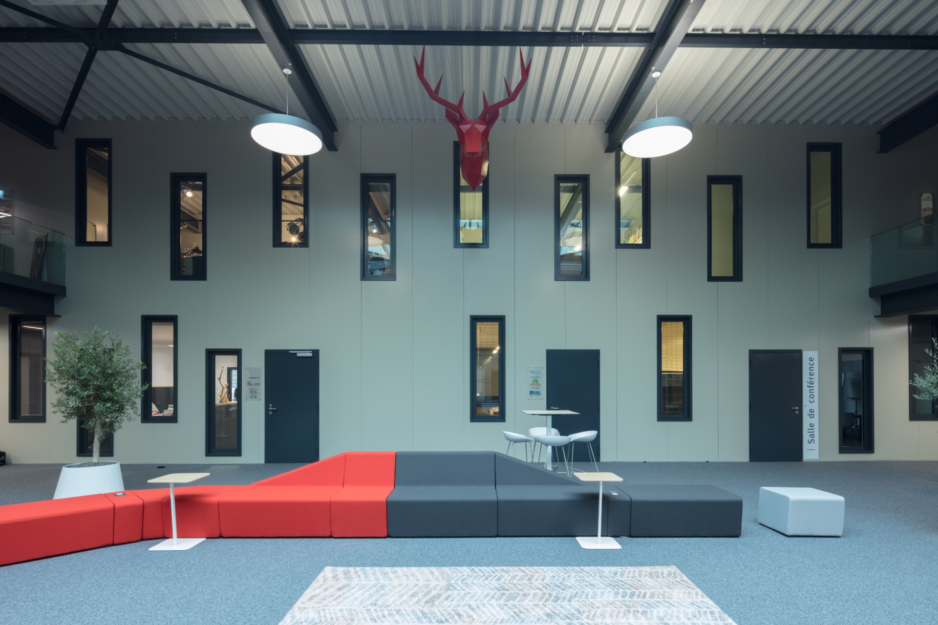Aménagement d'un Hall Type de mobilier founi : Canapés, tables hautes, tabourets, décoration, bacs à plantes, ...