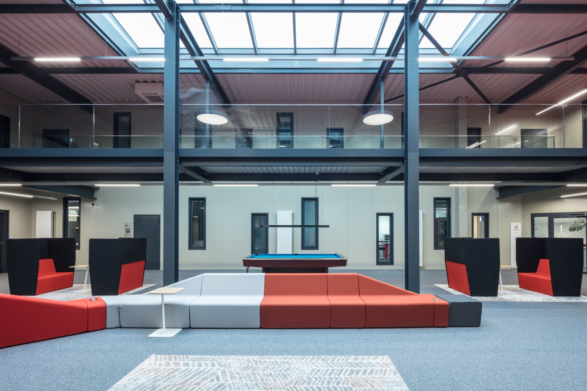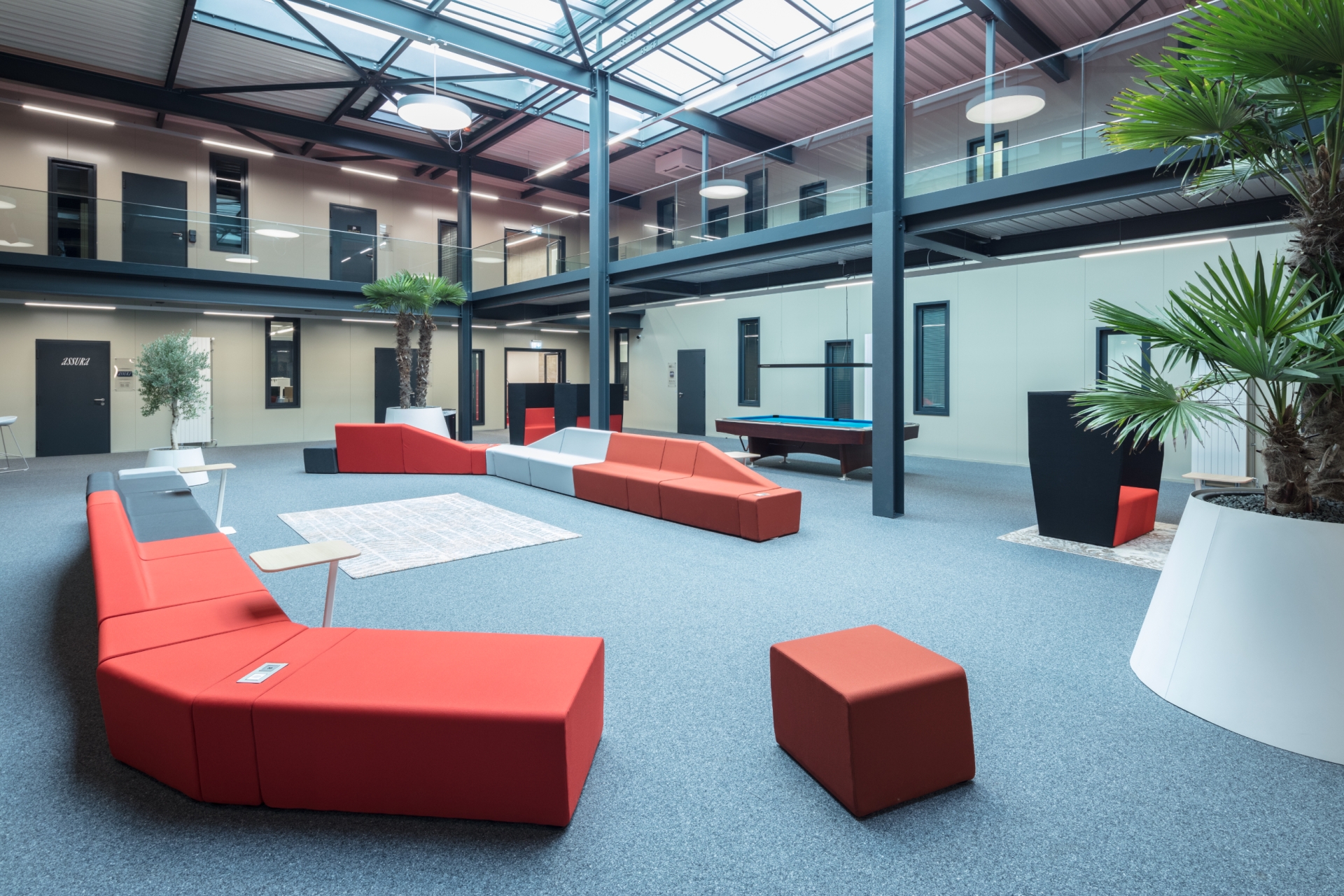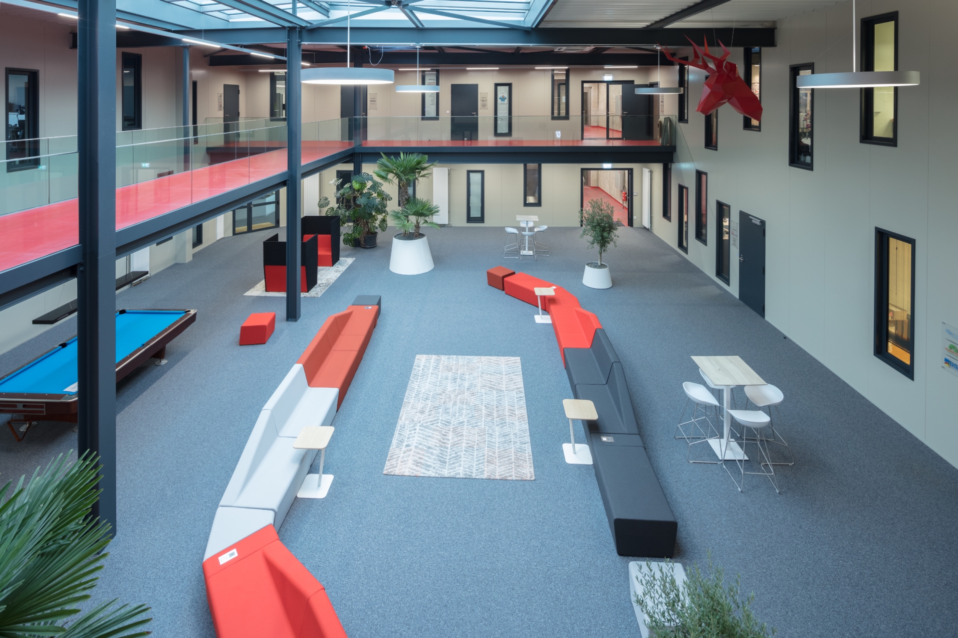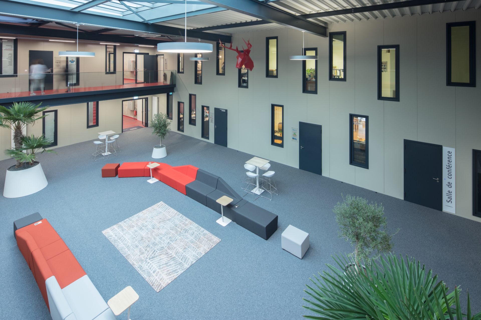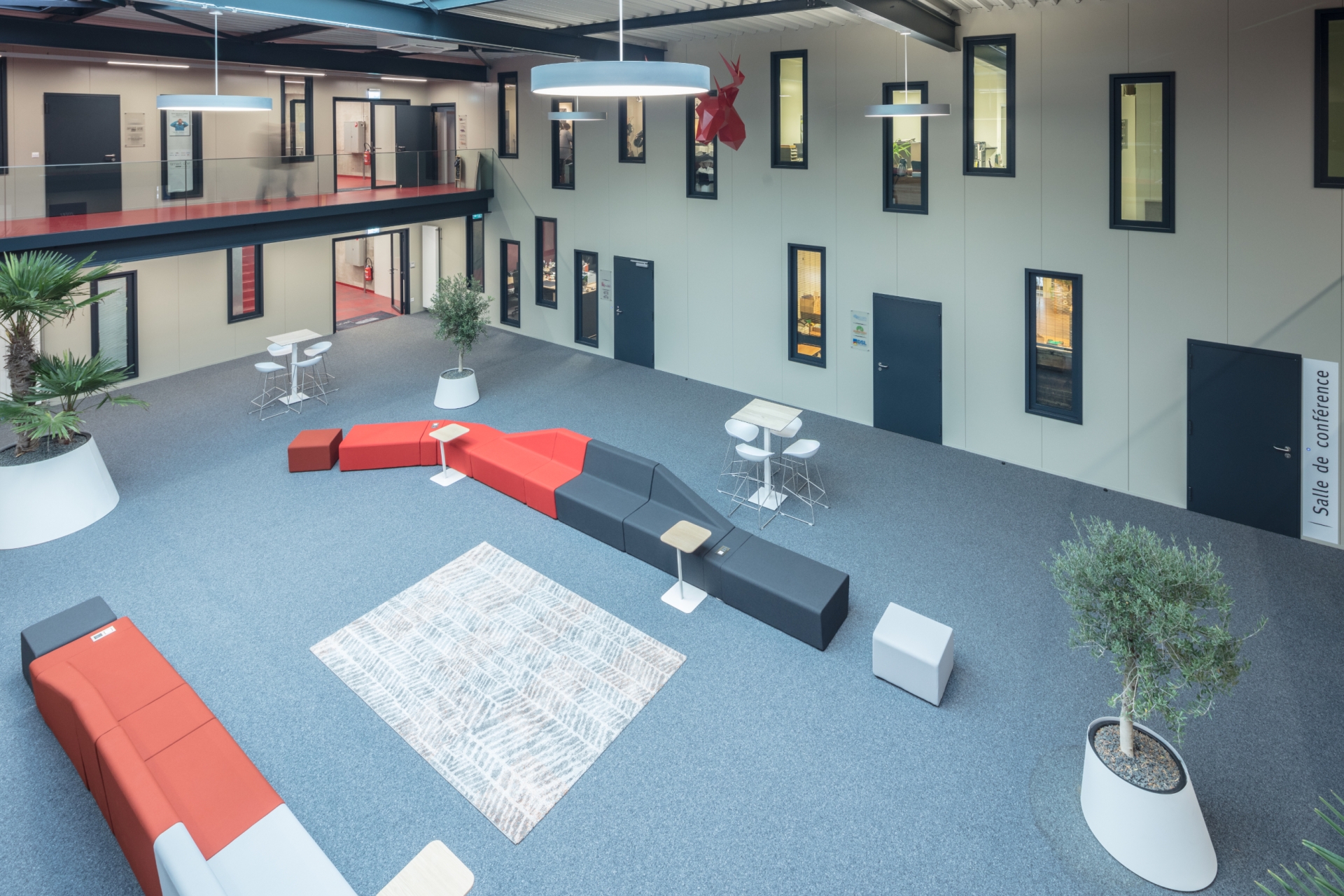 Aménagement d'un Hall Type de mobilier founi : Canapés, tables hautes, tabourets, décoration, bacs à plantes, ...